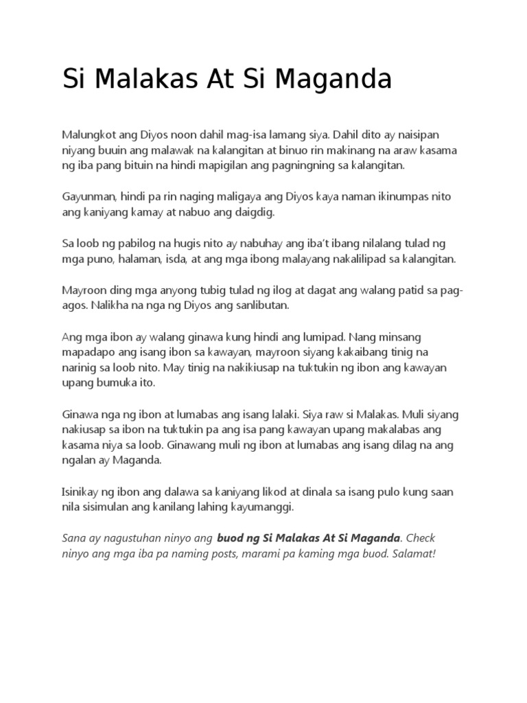 Si Malakas At Si Maganda Buod Malungkot ang Diyos noon dahil mag-isa lamang siya. Iyong palabasin ang aking kasama Tinuktok ng hari ng mga ibon ang isa pang kawayan. Gayunman hindi pa rin naging maligaya ang Diyos kaya naman ikinumpas nito ang kaniyang kamay.